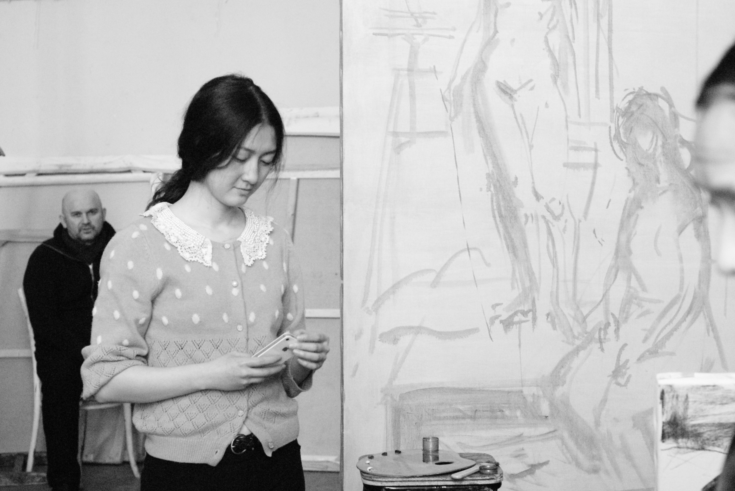 Image précédente Image suivante Portrait atelier Portrait atelier Portrait à l’atelier avec en fond le professeur de peinture Cavkuev Xamid