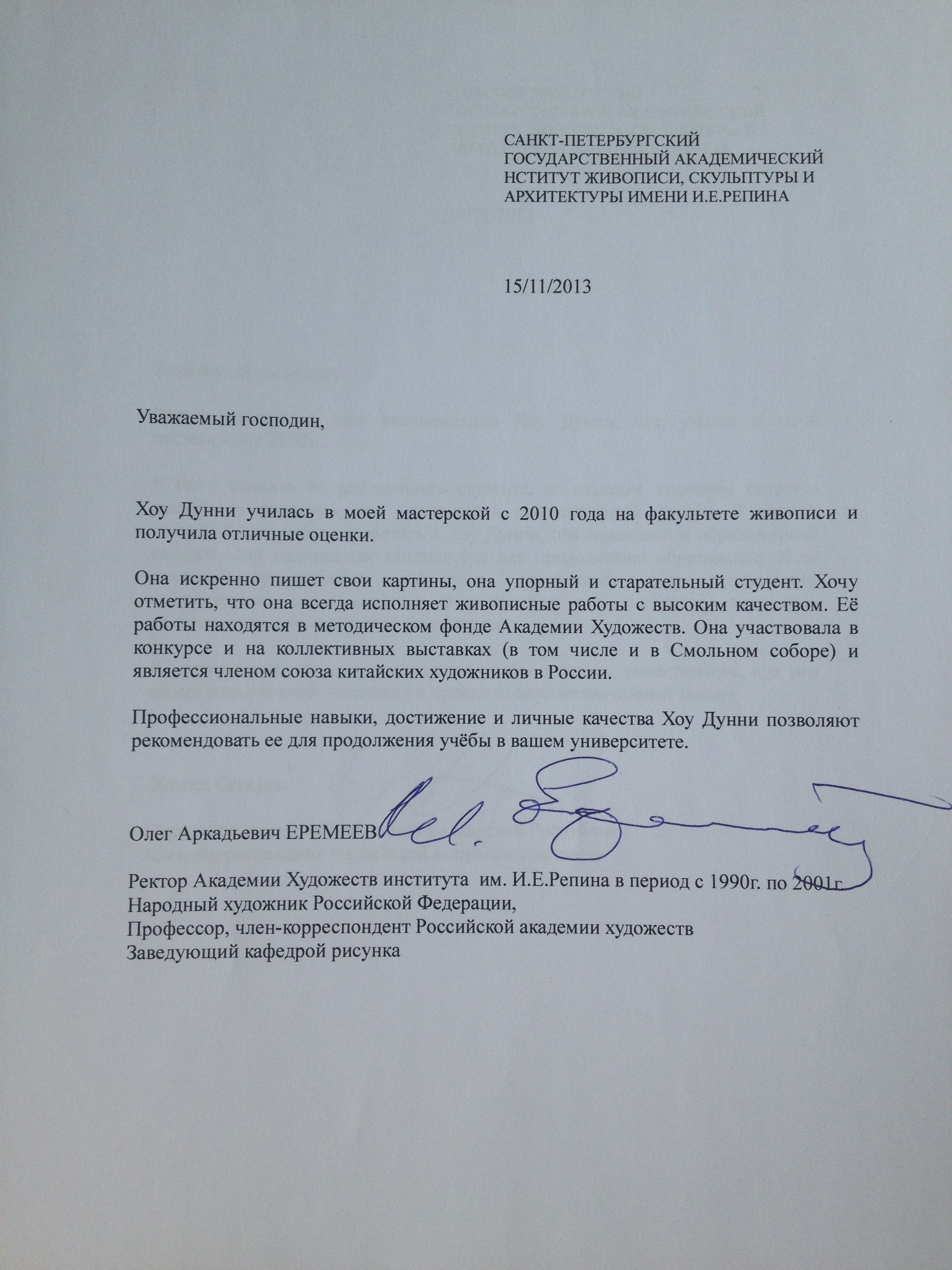 Image précédente Image suivante Lettre de recommandation du professeur Eremeev Lettre de recommandation du professeur Eremeev.