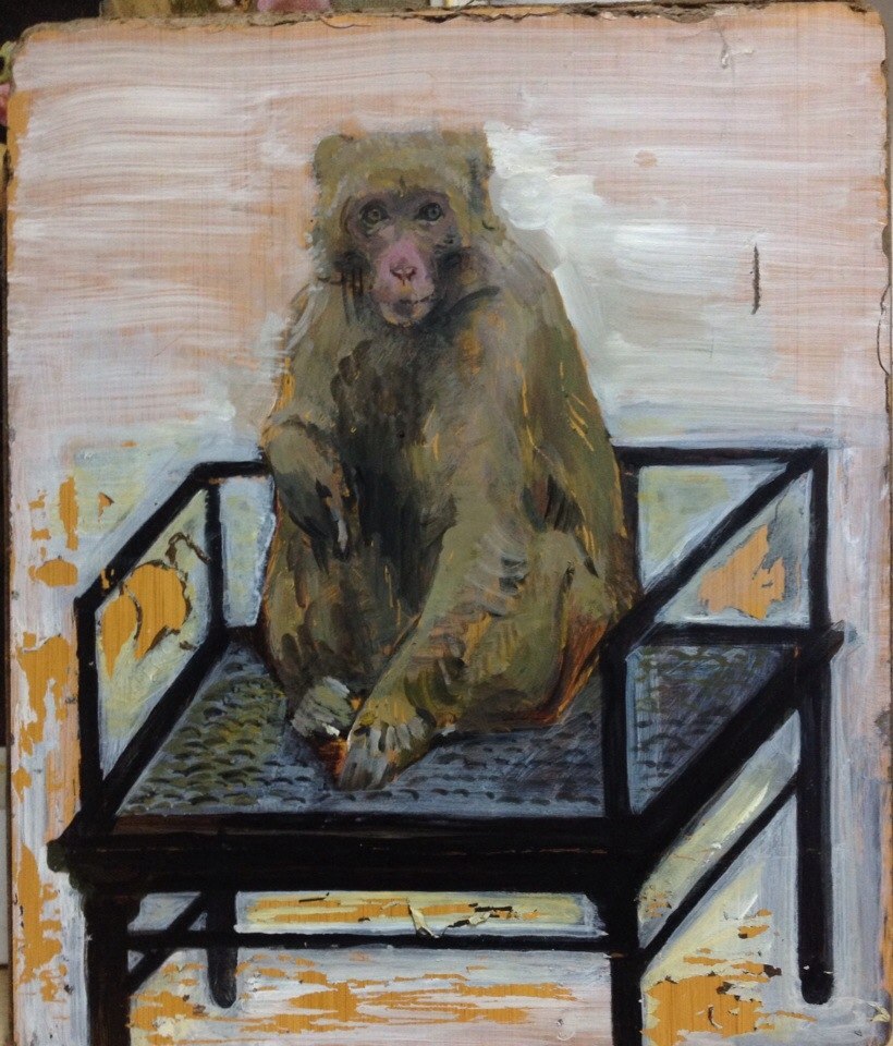 Le sujet du tableau est philosophique, le spectateur s’interroge sur la présence d’un singe à la place de l’Homme sur sa chaise. Esquisse réalisée en octobre 2014.